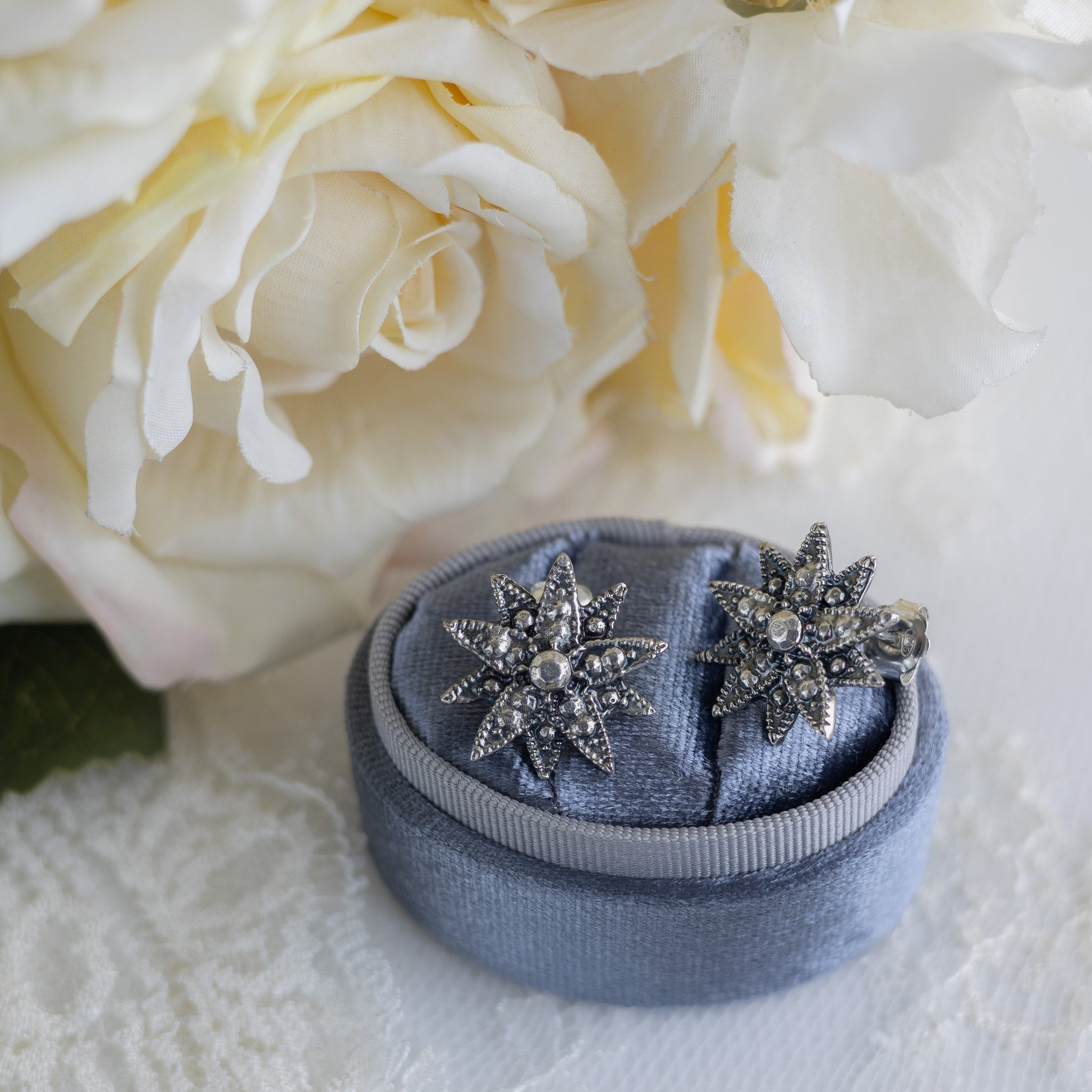 Brincos com formato de estrela, feitos em prata de lei 925, com cerca de 2 cm de diâmetro.